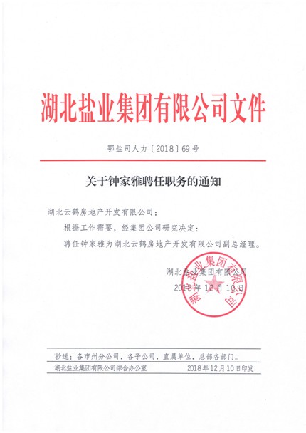關(guān)于鐘家雅聘任職務(wù)的通知