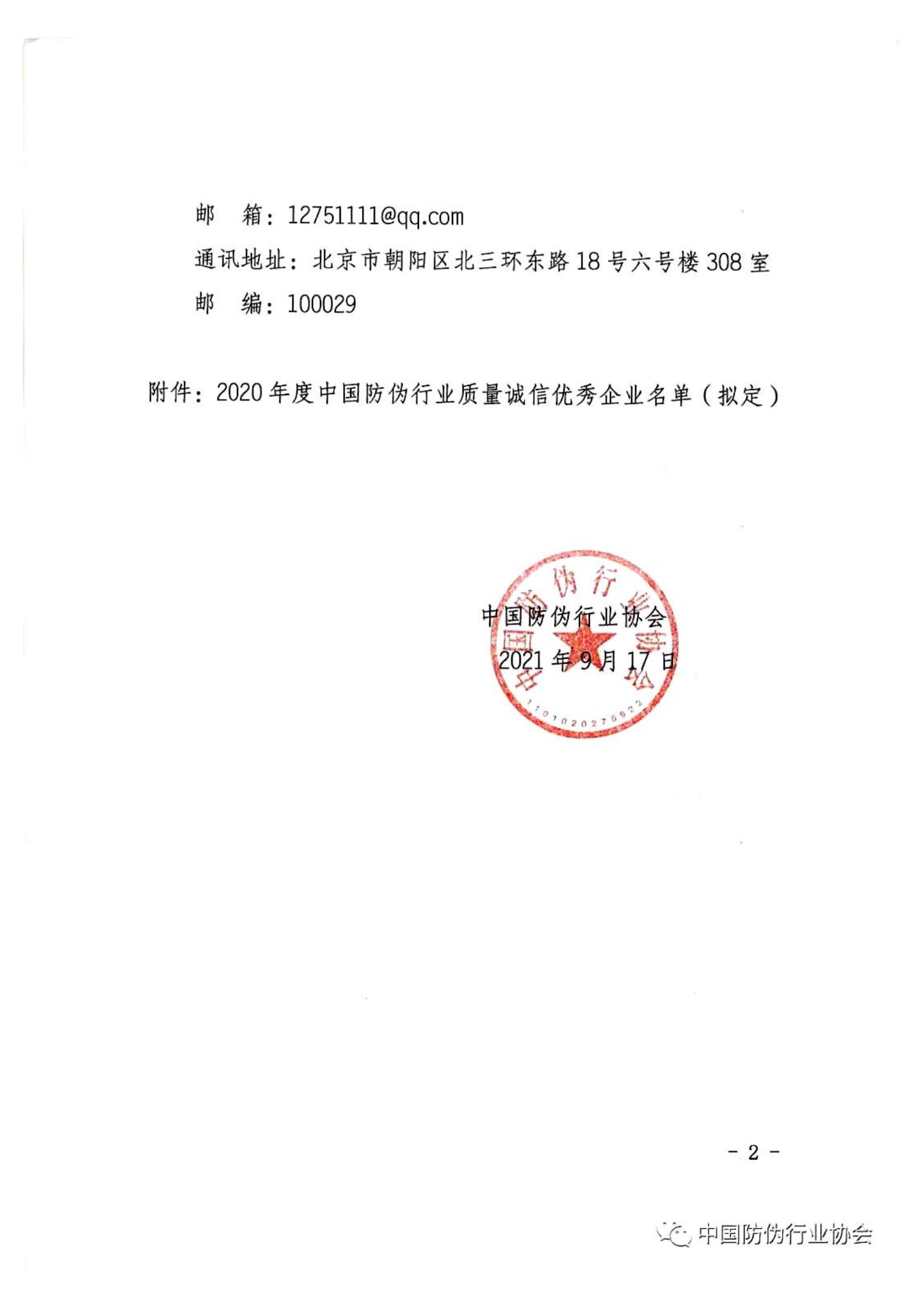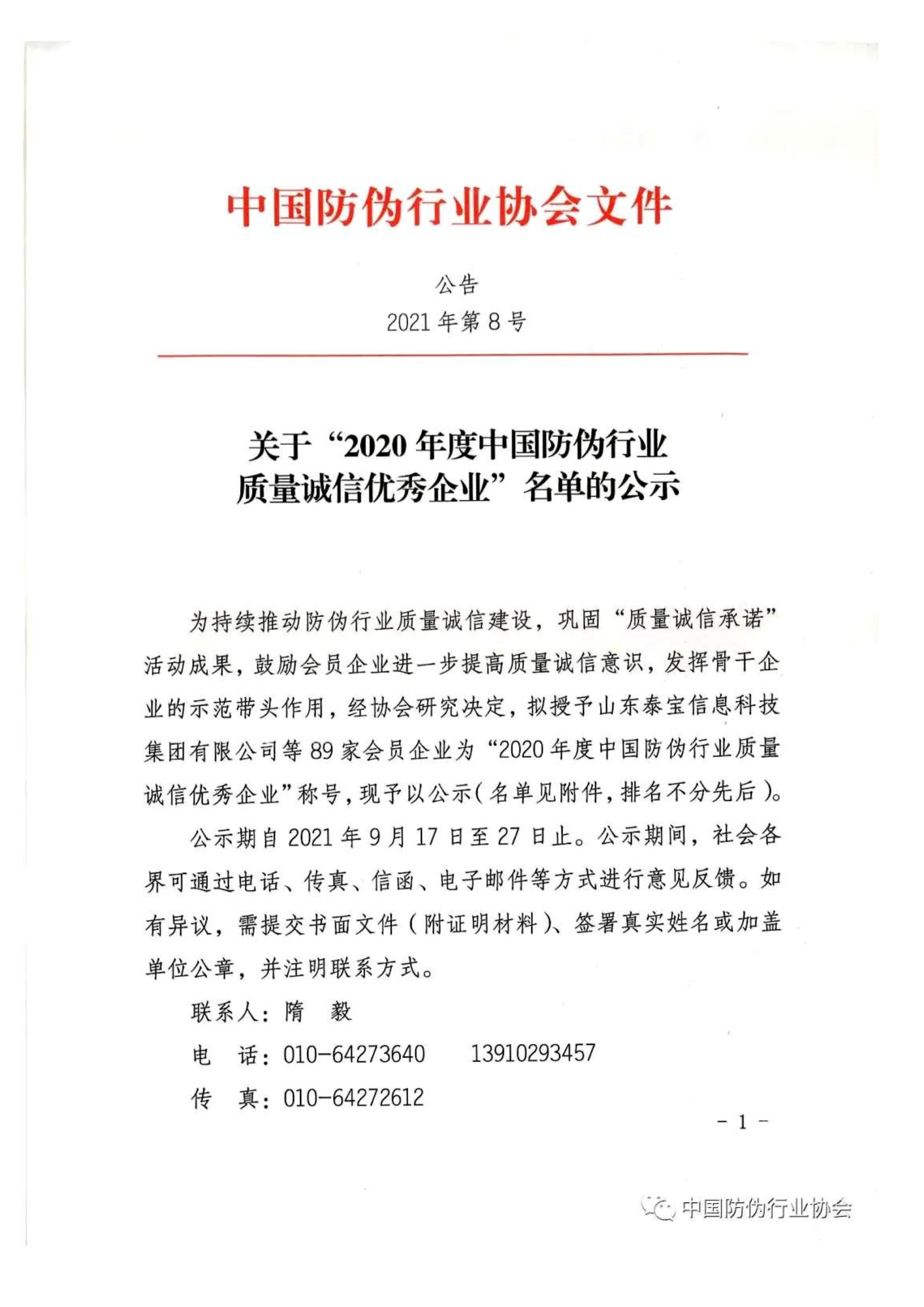 關(guān)于“2020年度中國(guó)防偽行業(yè)質(zhì)量誠(chéng)信優(yōu)秀企業(yè)”名單的公示